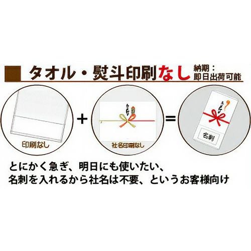 他の画像を見る 2~3日出荷可能 【特急便】御挨拶用粗品タオル(のし印刷あり・タオル白無地)(カード他) ¥ 9,009 税込 〜 ¥ 税込 御挨拶用タオル・熨斗(のし)に社名・店名などを印刷します。ご注文から翌日~2日で出荷いたします。 詳細を見る お気に入りに登録